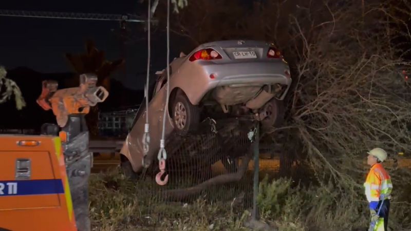 Durante la madrugada de este martes, un automóvil terminó sobre la reja perimetral de la caletera de la autopista Vespucio Norte, en la comuna de Quilicura, luego de que su conductor perdiera el control del vehículo y se volcara. El incidente ocurrió en la zona norte de Santiago, cuando, por causas que se investigan, el chofer activó el freno de mano mientras era perseguido por otro automóvil.